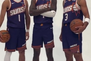太阳队媒体日布克和两大新援杰伦格林狄龙布鲁克斯一起拍摄定妆照