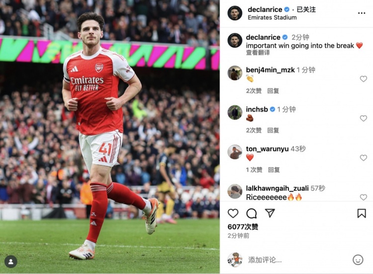 赛后,赖斯更新社交媒体晒照庆祝胜利,并配文写道:带着一场重要的胜利进入休整期❤️