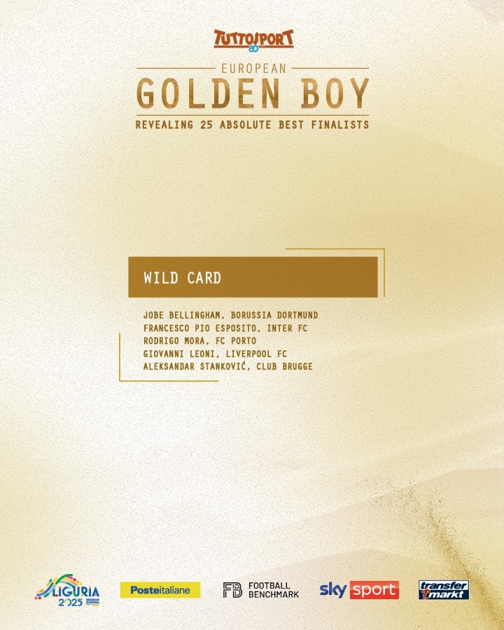 你看好谁?金童奖25人候选:库巴西、杜埃、赫伊森、斯凯利在列