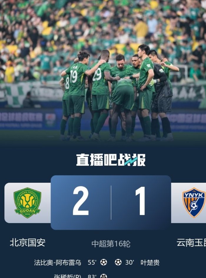 6月30日讯 北京时间19:35,中超第16轮北京国安vs云南玉昆,比赛在北京工人体育场打响!上半场,叶楚贵帮助客场作战的云南玉昆取得领先!法比奥禁区倒地获得点球,随后被VAR取消!下半场,张玉宁头球摆渡,阿布雷乌扳平比分!张玉宁随后又制造点球!张稀哲主罚命中!